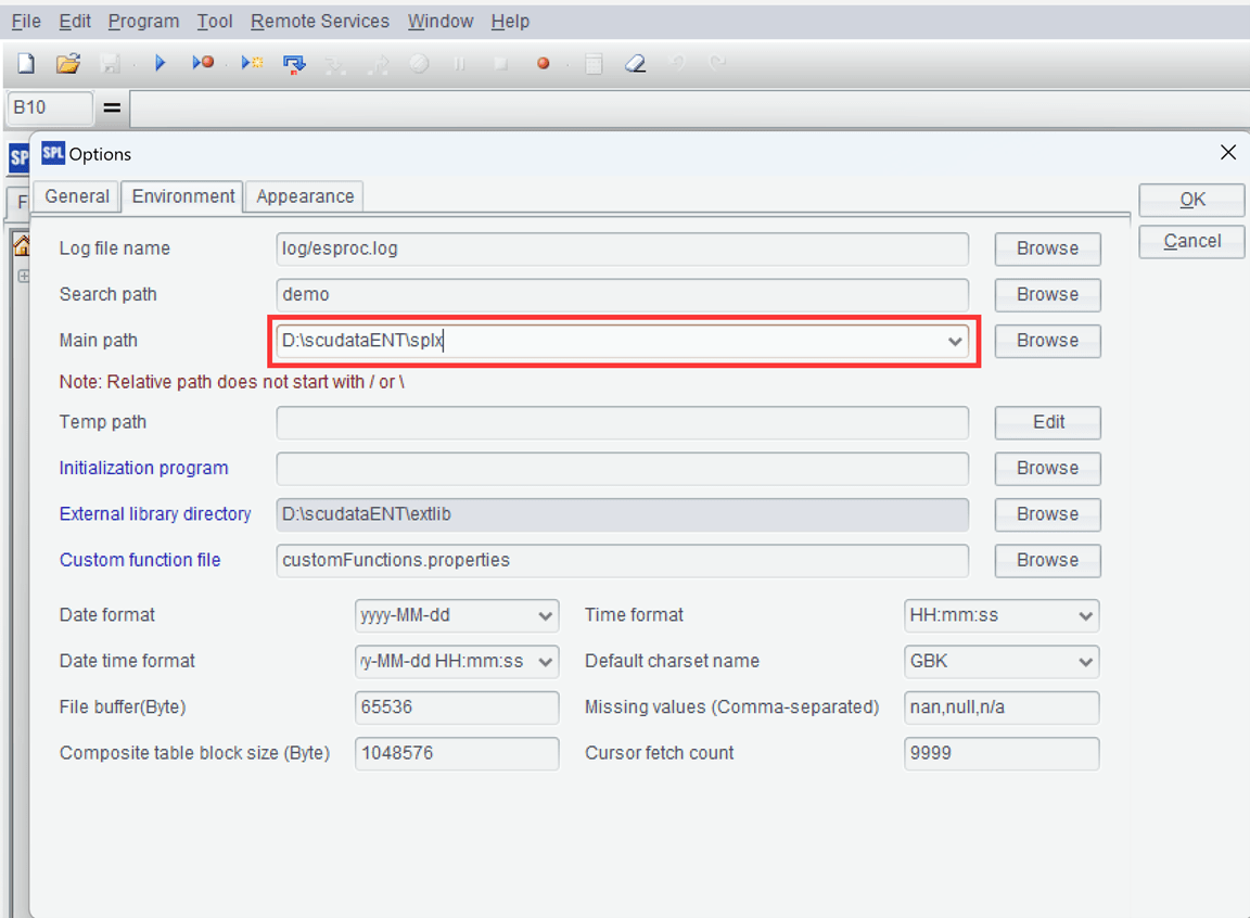 2. Modify the configuration file, where the IDE main directory is the key. First, run esProc installation directory\esProc\bin\esproc.exe (esproc.sh) to start IDE. Then find “Main path”, which is IDE main directory, through IDE menu item Tool->Options.