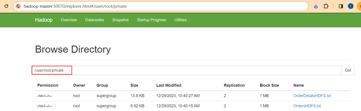 We need to upload data to the remote storage before writing a SPL script. Take HDFS as an example. First, we log in on HDFS client side or a cluster node, create a directory (such as private) using hdfs dfs -mkdir command, upload data files using hdfs dfs -put command, and view the upload result through hdfs df -ls command. The result is as follows: