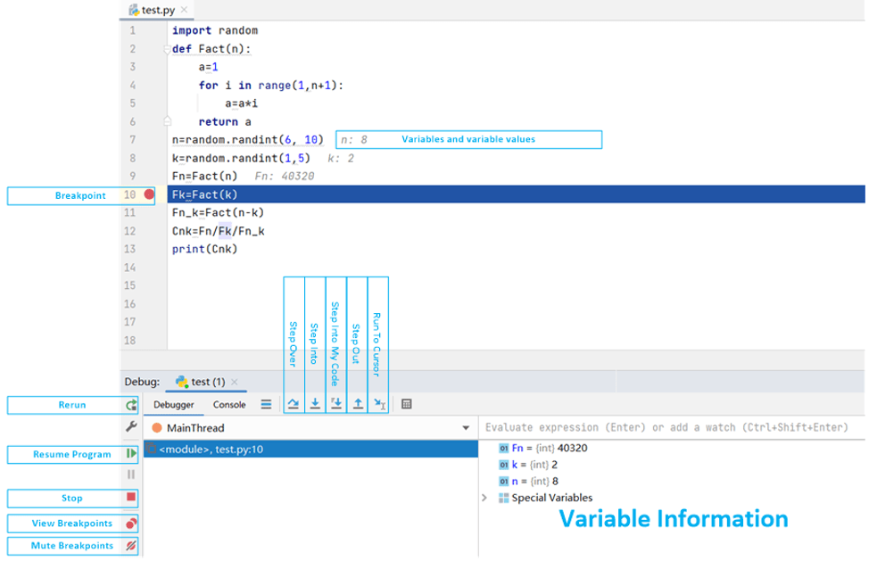 Now let’s talk about debugging. Python provides many IDEs, the most commonly used ones include Pycharm, Eclipse, Jupyter Notebook, etc. Each IDE has its own advantages and disadvantages, but the most commonly used debugging method of Python is still ‘print’ (print the variable values we want to watch), which is troublesome, and the print code needs to be deleted after debugging. The setting and execution of breakpoint are the normal functionality of Python IDEs, which is useful for debugging. It is worth noting that most IDEs of Python provide the functionality of completing variables and functions, which can save a lot of time when coding.
